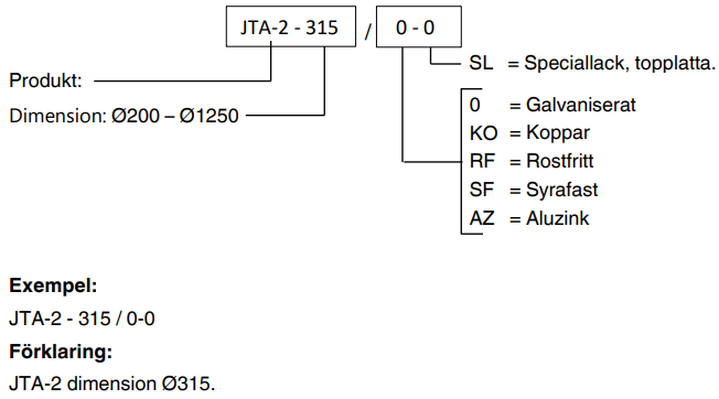 JTA-2 är tillverkad i galvaniserat stål. Spjället är tillverkat i aluminium. Anslutningen har EPDM gummipackning. Topplattan är lackerad i svart RAL 9005 som standard. JTA-2 kan levereras i andra material och kulörer på begäran.