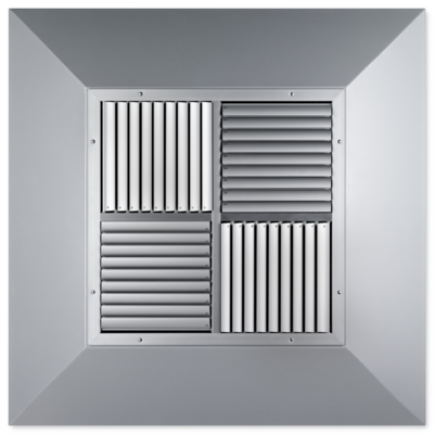 Virvelventiler med fyrkantig front för höga utrymmen i komfort- och industrizoner. Endast för tilluft. Spjäll i diagonalt motstående sektioner kan justeras för luftutblås från horisontellt (0°) till vertikalt (90°). Horisontellt luftutlopp med hög induktion. För frihängande installation eller för installation i alla typer av tak.